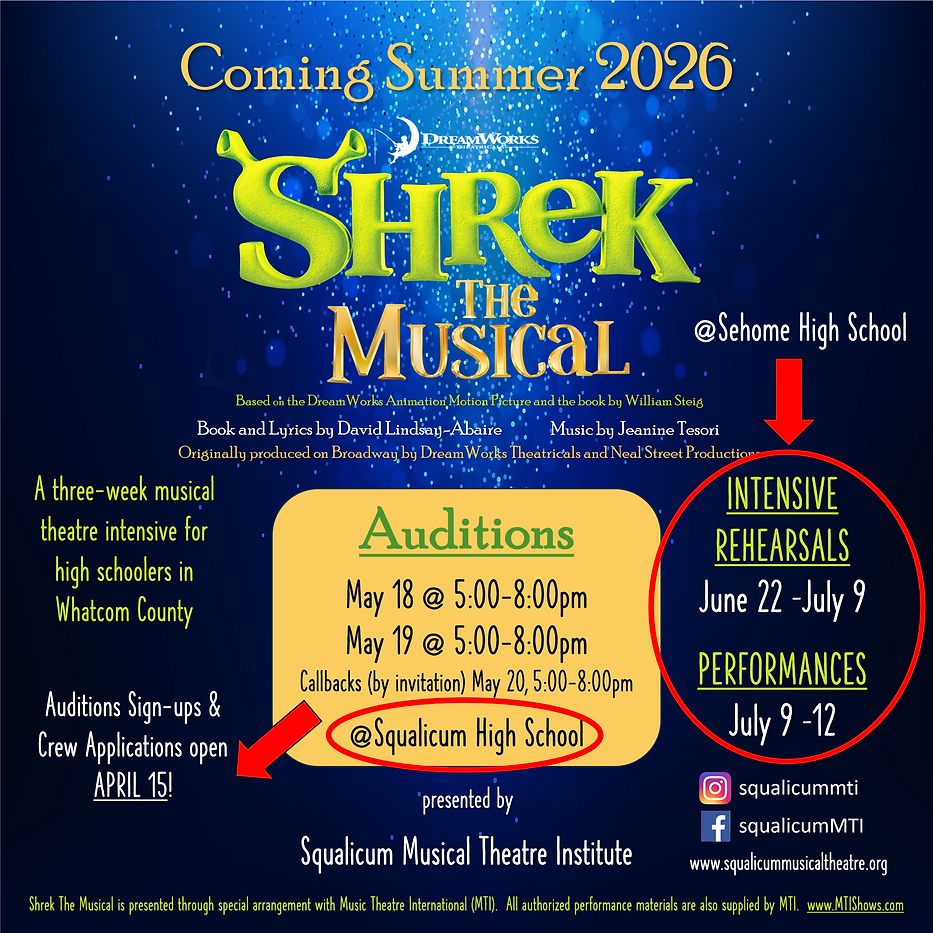 Due to major construction at Squalicum this summer, we are moving our rehearsals and performances to Sehome High School (with two rehearsals days at Options High School). Auditions in May will still be at Squalicum (sign-ups open April 15).